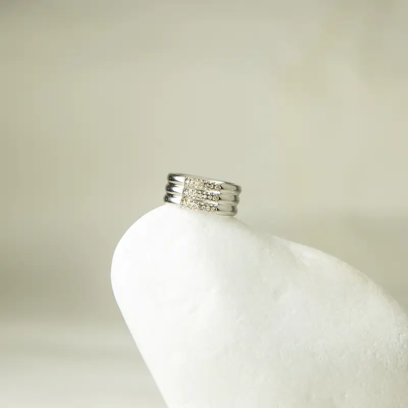 με καθαρό, σύγχρονο σχέδιο που συνδυάζει απλότητα και λάμψη. Οι παράλληλες γραμμές δημιουργούν δομημένη εικόνα, ενώ τα ζιργκόν στο κέντρο προσθέτουν φωτεινή λεπτομέρεια χωρίς υπερβολή. Το αποτέλεσμα δείχνει κομψό και ισορροπημένο.