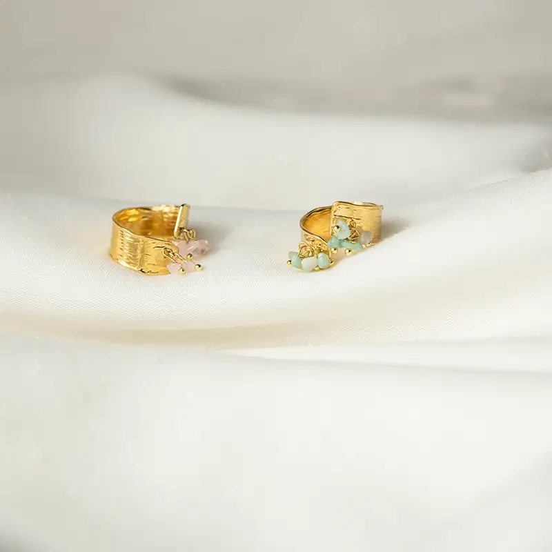 Ένα δαχτυλίδι που μοιάζει να ψιθυρίζει ιστορίες καλοκαιριού. Με ανάγλυφη επιφάνεια και παιχνιδιάρικες ημιπολύτιμες πέτρες που κρέμονται απαλά, το Isadora συνδυάζει το μποέμ με το elegant. Φοριέται μόνο του για πιο καθαρό statement ή με layering για πιο προσωπικό στυλ. Ιδανικό για κάθε μέρα αλλά και για πιο ιδιαίτερες εμφανίσεις.