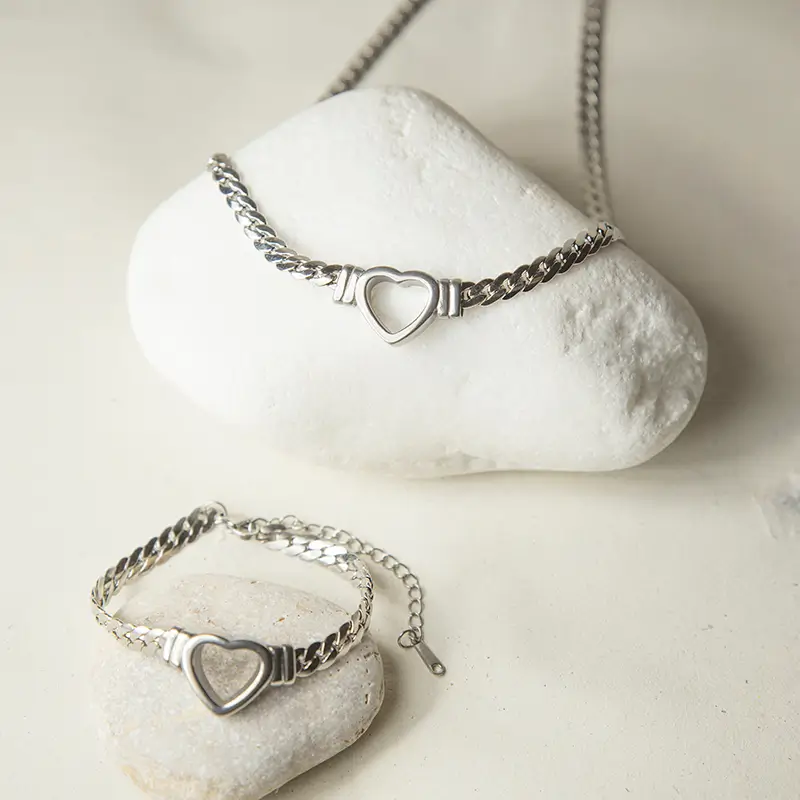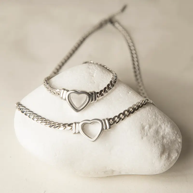 Η καρδιά στο κέντρο προσθέτει διακριτικό συμβολισμό και κρατά το σχέδιο καθαρό. Δεν κυριαρχεί στο σύνολο, αλλά συμπληρώνει την αλυσίδα με ισορροπία. Ο συνδυασμός μετάλλου και φόρμας δημιουργεί σύγχρονη αισθητική.