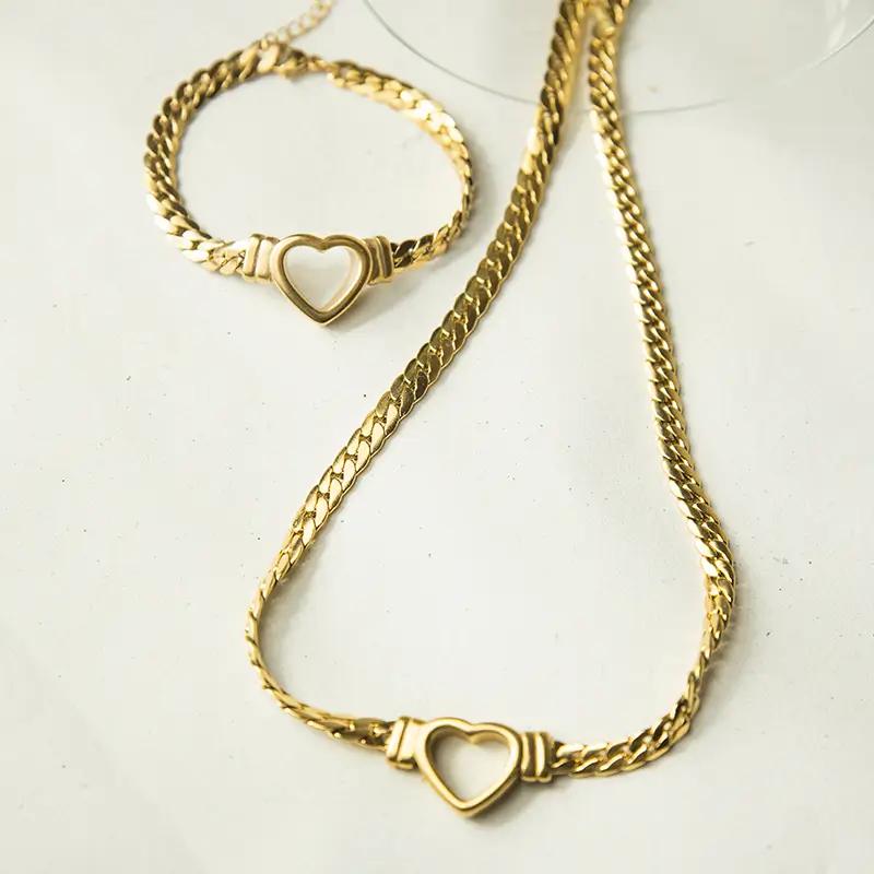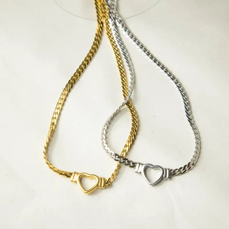 με δίχρωμο σχεδιασμό που συνδυάζει αρμονικά το χρυσό και το ασημί. Η αλυσίδα έχει καθαρή πλέξη και δημιουργεί ισορροπημένη εικόνα στον λαιμό. Στο κέντρο, η διακριτική καρδιά λειτουργεί ως ήπια λεπτομέρεια που ολοκληρώνει το σχέδιο χωρίς υπερβολή.