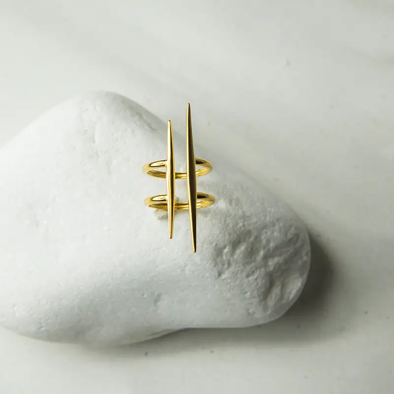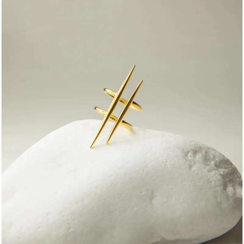που προσθέτει καθαρή, γεωμετρική κομψότητα σε κάθε εμφάνιση. Το ξεχωριστό αυτό κομμάτι δημιουργεί statement αισθητική με δύο παράλληλες χρυσές γραμμές που σχηματίζουν minimal αλλά δυναμικό αποτέλεσμα. Η επιμήκης φόρμα του δαχτυλιδιού δίνει ύψος στα δάχτυλα και ενισχύει τη θηλυκή γραμμή του χεριού, ενώ η λεία επιφάνεια προσφέρει άμεση λάμψη.