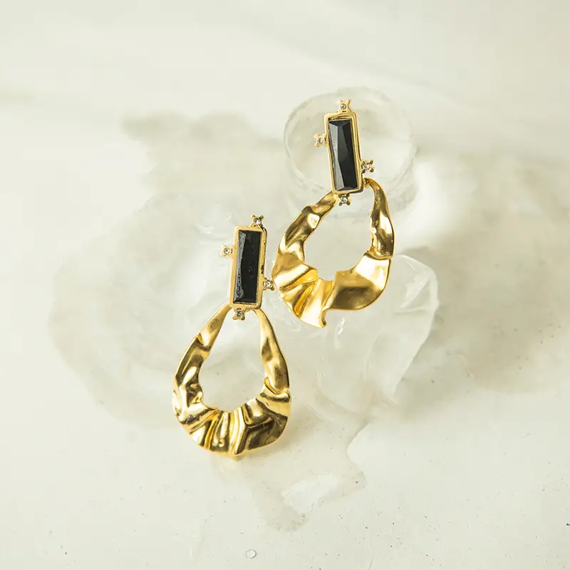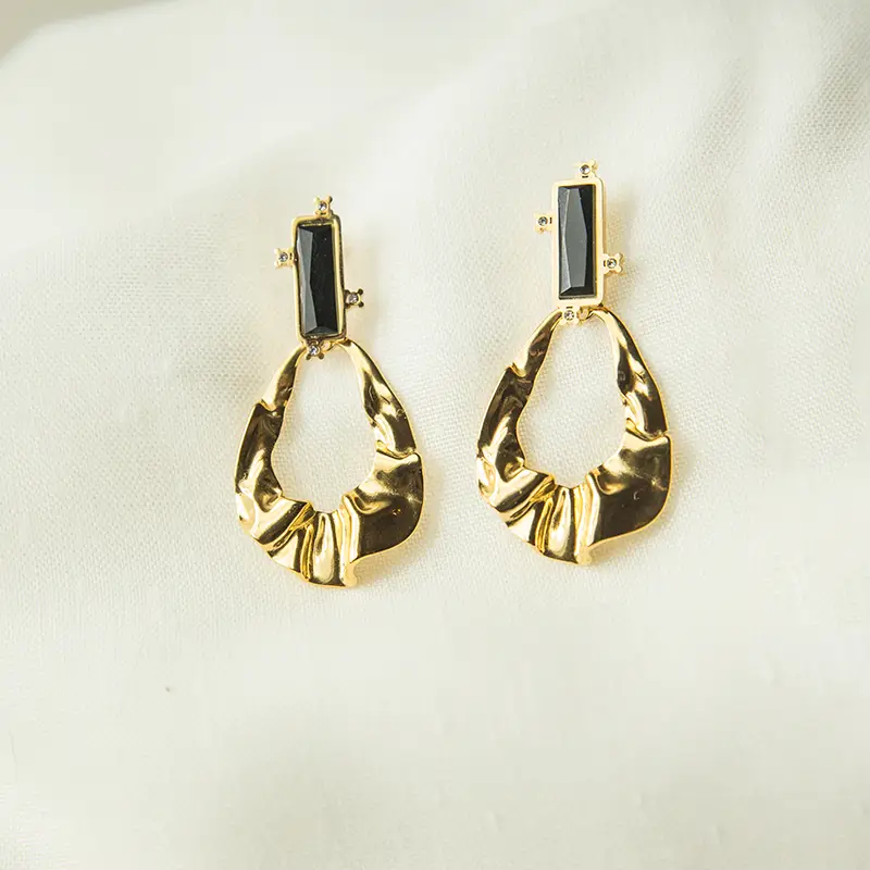 Η μαύρη λεπτομέρεια λειτουργεί ως σημείο ισορροπίας στο σχέδιο. Δημιουργεί καθαρή αντίθεση με το χρυσό χρώμα και δίνει μοντέρνα αισθητική στα σκουλαρίκια. Ο συνδυασμός των υλικών κάνει το σχέδιο πιο δυναμικό και ξεχωριστό.